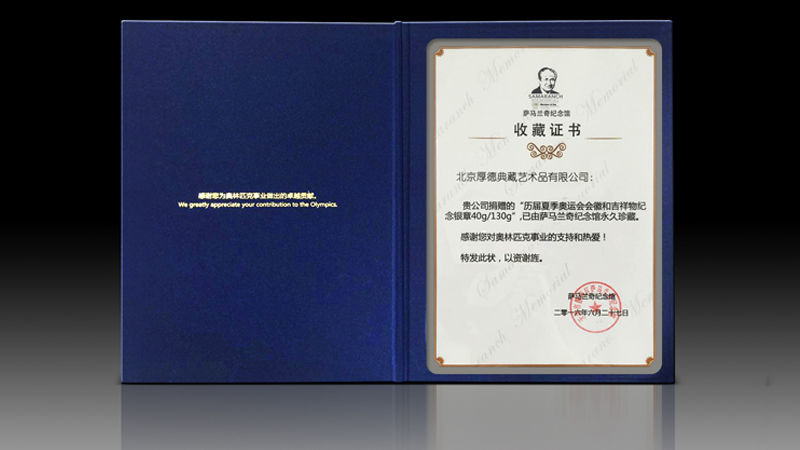 《历届夏季奥运会会徽和吉祥物纪念金(银)章》 萨马兰奇纪念馆 收藏证书