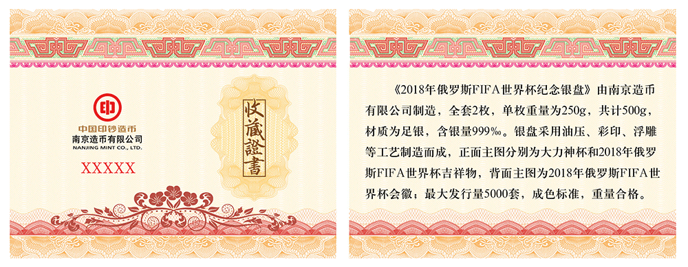 2018年6月14日-7月15日,2018年俄罗斯FIFA世界杯暨第21届世界杯足球赛将于俄罗斯联邦境内举行。本届FIFA世界杯88年来首次在俄罗斯举办,首次登陆东欧,“双首次”的历史性时刻,意义更加重大! 为热烈迎接并隆重纪念2018年俄罗斯世界杯的盛大召开,国际足联官方授权2018年俄罗斯FIFA世界杯官方特许产品《2018年俄罗斯FIFA世界杯纪念银盘》,一次集藏世界杯最具代表性的核心元素——大力神杯、会徽,作为一份专属纪念藏品,献给全世界的足球爱好者。 产品材质为Ag 999,共分3个规格,分别为:100g*2枚、250g*2枚、500g*2枚。正面主图分别为FIFA世界杯代表性元素大力神杯和吉祥物,辅以俄罗斯风情建筑元素;背面均为2018年俄罗斯FIFA世界杯会徽。 以千年传承的商周礼器,承载世界杯精神。采用对盘形式,以古代帝王贵族用以礼祀、行盥洗之礼的礼器形式,纪念极具现代精神的世界杯元素,中西结合、古今融通;取义“双”,纪念“FIFA世界杯双首次”;取义“圆”,祝愿2018年俄罗斯FIFA世界杯圆满举行。 |